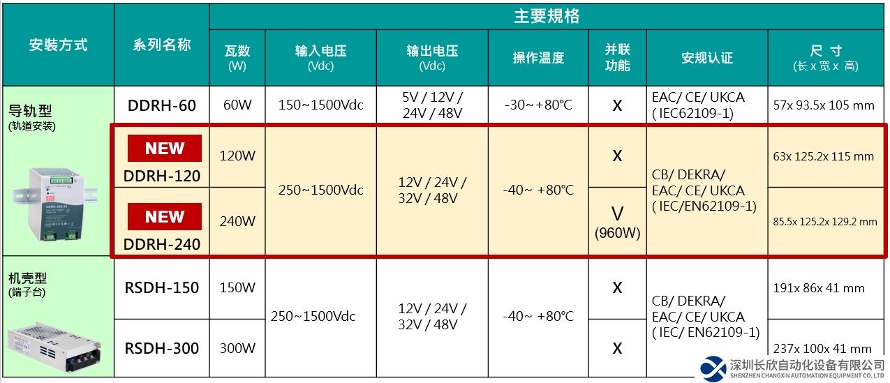 近年來光伏、儲(chǔ)能…等再生能源相關(guān)行業(yè)需求驟增,明緯繼推出DDRH-60、RSDH-150/300后(詳如下表),緊接著新上市120W/240W超寬250~1500Vdc高壓輸入導(dǎo)軌式DC-DC轉(zhuǎn)換器~ DDRH-120/240系列。