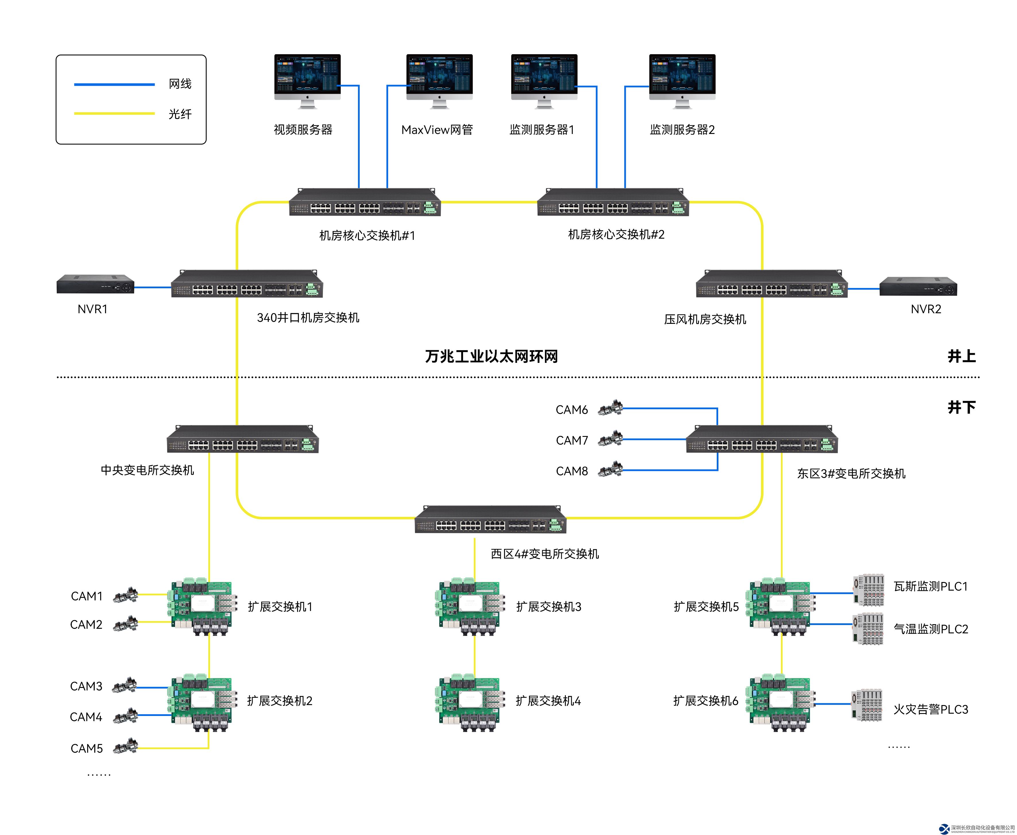 該方案在地面信息機房配置了兩臺三層網管萬兆交換機,作為整個環(huán)網的核心交換機。在地面通風機房和主井機房再分別安裝一臺萬兆環(huán)網交換機,通過萬兆光口與核心交換機的萬兆光口組成地面萬兆以太環(huán)網。在井下變電所,我們安裝了三臺井下環(huán)網交換機,通過萬兆端口和地面核心交換機形成井上下萬兆以太環(huán)網,井下萬兆環(huán)網交換機通過千兆光口級聯(lián)千兆交換機進行數(shù)據(jù)口擴展。
