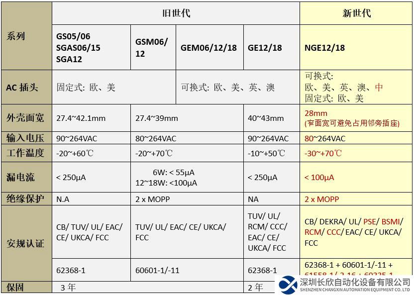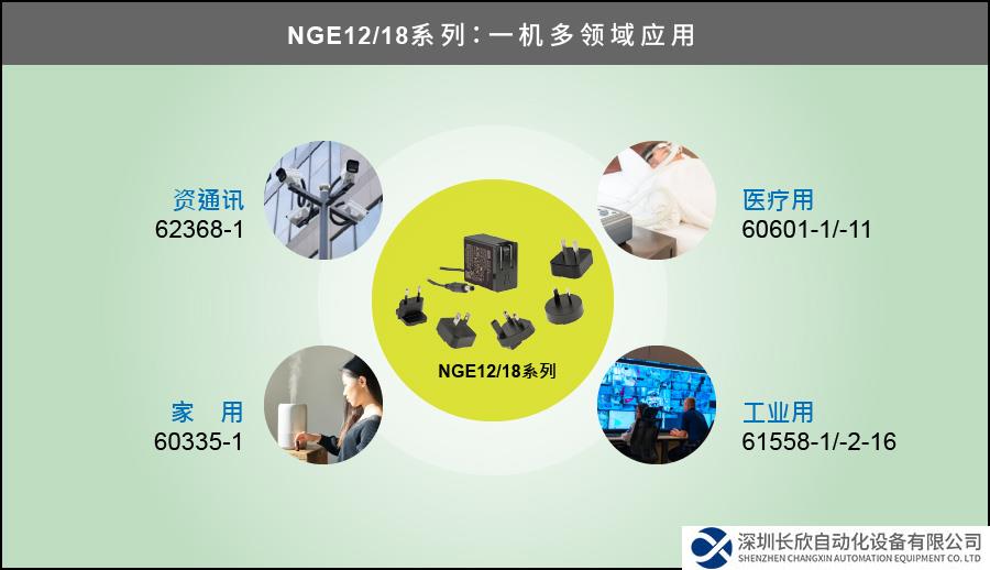 NGE12/18 相較于上市多年的 5~18W GE/ GEM/ GS/ GSM/ SGA/ SGAS 等系列,最大差異是一機同時擁有 62368-1/ 60601-1/ 61558-1/ 60335-1 等各應(yīng)用領(lǐng)域安規(guī),并增加了CCC/ BSMI/ PSE認(rèn)證、其窄面寬 (28mm) 設(shè)計可避免占用鄰旁插座、寬溫 -30~+70℃ 使用國家或安裝空間較不受限、整體設(shè)計符合 2xMOPP 并適用醫(yī)療 BF 類...等 (詳細(xì)差異如下表)。本產(chǎn)品是一款高質(zhì)量、壽命長、認(rèn)證齊全的插墻式節(jié)能適配器,非常適用于各種消費性電子、商旅用裝置、或任何需跨國搭配可換式 AC 插頭等電子產(chǎn)品應(yīng)用。